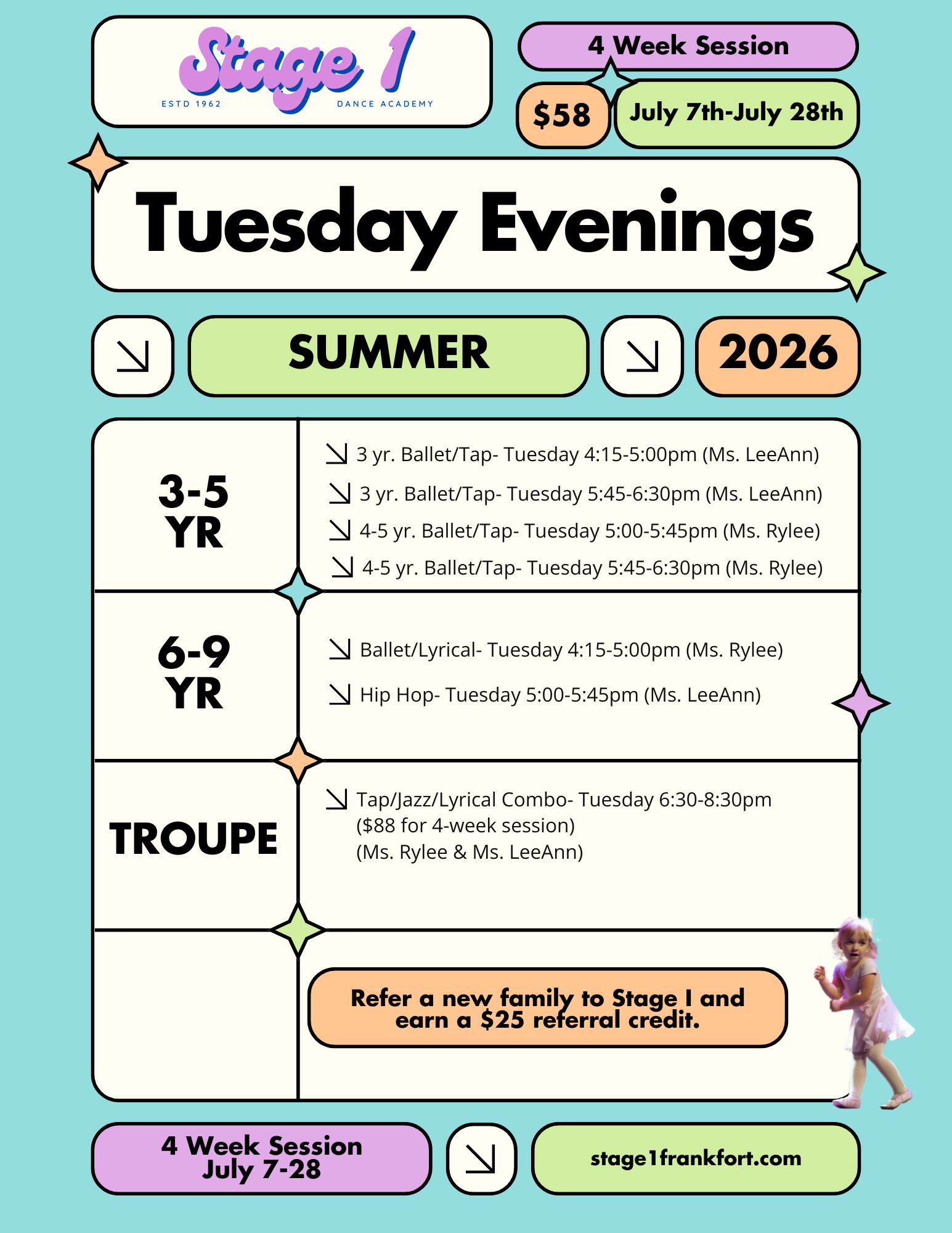 This is our 2nd year at this studio! We love it! My older daughter takes 2 classes (lyrical and tap/jazz) and my younger takes the ballet/tap combo class for preschoolers. They love their dance teachers and are excited to go every week!